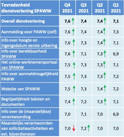 De overall tevredenheid met de dienstverlening is duidelijk verbeterd in de loop van het jaar. Overigens laat de gemiddelde tevredenheid met de dienstverlening van SPAWW over het hele jaar 2021 daarmee een mooie stijging zien van een 7,1 in Q1 naar een 7,6 in Q4. Over praktisch de hele linie stijgt de tevredenheid.